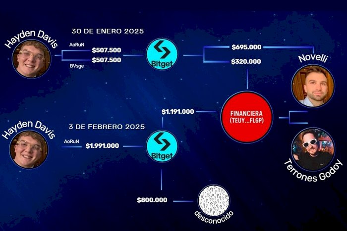 *Una primera coincidencia que señala Romeo es que Davis transfirió 1.015.000 USDT desde dos de sus billeteras (AoRuN y BVsge) hacia una cuenta en la plataforma Bitget. Esto ocurrió el 30 de enero de 2025. Fue el día que se reunió en la Casa Rosada con Milei, y que se sacaron una foto. "Hoy mantuvimos una muy interesante charla con el empresario Hayden Mark Davis", decía el posteo del mandatario, que compartió la imagen. En aquella reunión habrían cerrado detalles relacionados con el lanzamiento de $Libra. Al día siguiente, la financiera identificada como vinculada Novelli y Terrones Godoy reciibó 320.000 USDT desde Bitget, mientras que Novelli recibió en sus cuentas personales 657.500 y 37.500 USDT, también provenientes de Bitget. El total es un monto coincidente con el girado por davis 1.015.000 USDT.