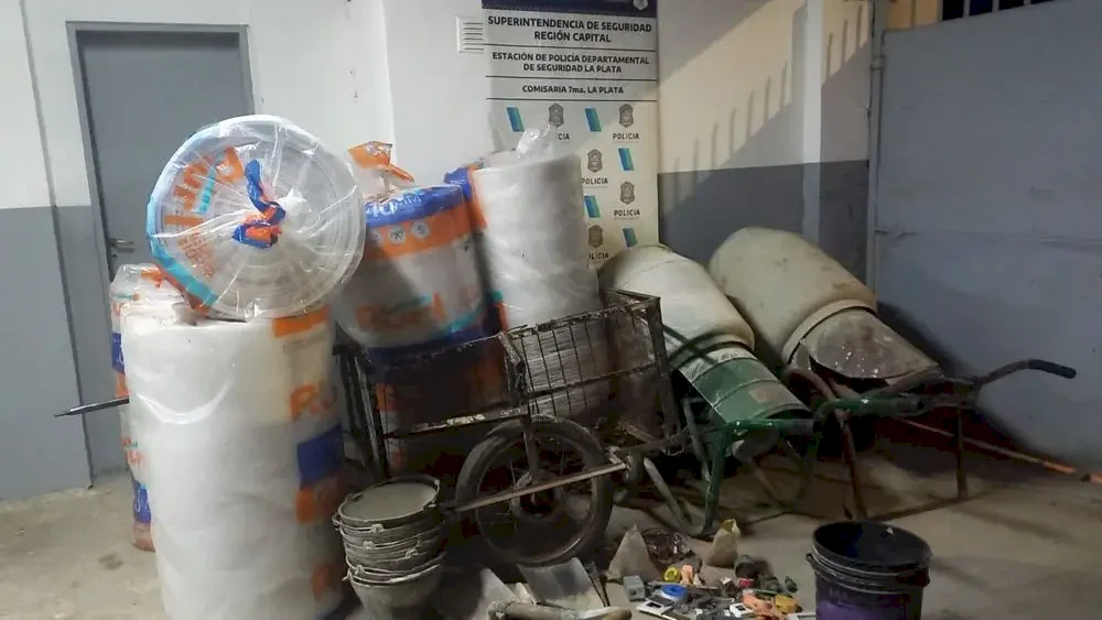 En la pensión ubicada en 515 y 187 la policía incautó dos trompos de albañil, dos palas anchas, 5 rollos de aislantes térmicos y un balde con herramientas de mano.