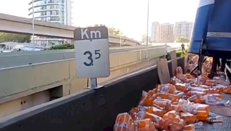 De acuerdo con lo que se pudo reconstruir Crónica HD, el camión, que llevaba decenas de botellas de un reconocido jugo energético, pasó por una curva y parte del contenido cedió, por lo que las bebidas quedaron todas desparramadas en el asfalto.